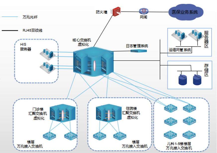 医院占地面积20000平方米,业务用房34000多平方米,现在有门诊楼,住院部,儿科楼等对医院内网进行升级改造项目。