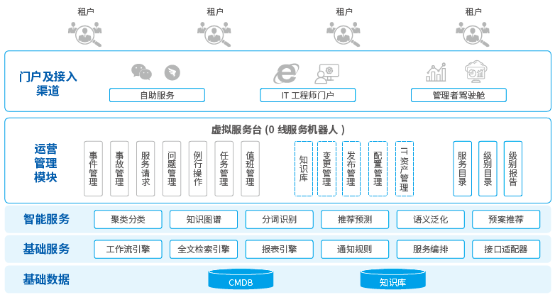 凯发K8信息智能流程自动化运营管理平台,在服务管理过程中嵌入人工智能和自动化技术,顺利获得独特的“虚拟服务台”,实现智能工单分类、告警模式识别、根因分析、智能问答、热点分析、自助化交付等多项功能,建立新一代IT 智能运营管理平台,提高服务交付效率和敏捷性,增强客户满意度,助力金融数字化转型落地。