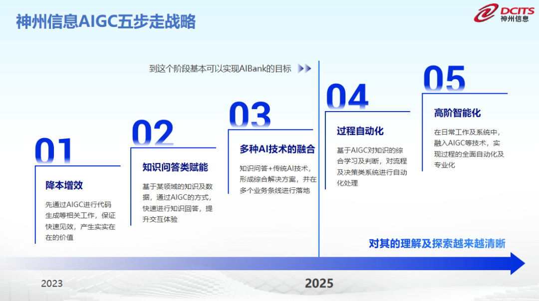 凯发K8信息制定了 AIGC 五步走战略,并为此制定了开展路径图:以降本增效为起点,到多种AI技术的融合基本可以实现AI Bank的目标,最终达到高阶智能化和专业化的开展路径。